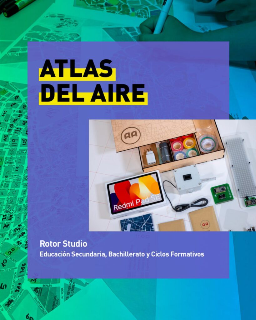 El programa ha sido creado por Rotor Studio, artistas multidisciplinares que cruzan el arte, la ciencia y la perspectiva ecosocial. Esta caja de recursos busca entender el reto de salud al que nos enfrentamos día a día en los entornos urbanos, fruto de la acción humana (vehículos, industrias, etc). Aborda la visualización de la calidad del aire del entorno del centro educativo mediante la práctica artística y transmedial de los datos, mapas e historias que a menudo quedan relegados a una nebulosa difícilmente entendible. El proyecto incluye una caja de herramientas que ofrece todos los materiales básicos para el desarrollo del proyecto, así como una guía-recurso con actividades. El programa requiere que el profesorado posea una competencia digital entre intermedia y avanzada. ATLAS DEL AIRE es un proyecto que se puso en marcha durante el curso 2024/2025 en el nodo valenciano de la red gestionado por PERMEA – Consorci de Museus de la Generalitat Valenciana y la Universitat Politècnica de València.
