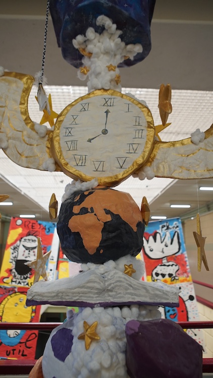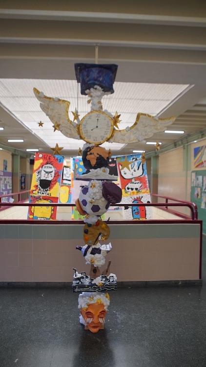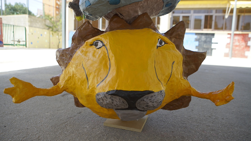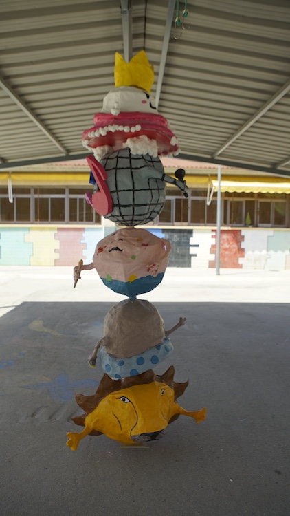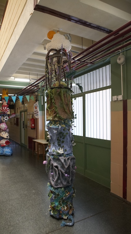 El proceso de diseño y construcción de los distintos tótems se ha desarrollado en grupos y ha involucrado la investigación sobre el contexto, la realización de distintos talleres colaborativos con los niños y niñas de todos los cursos escolares, y la aplicación de distintas técnicas escultóricas basadas en el cartón piedra.
